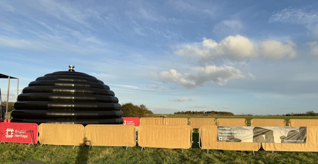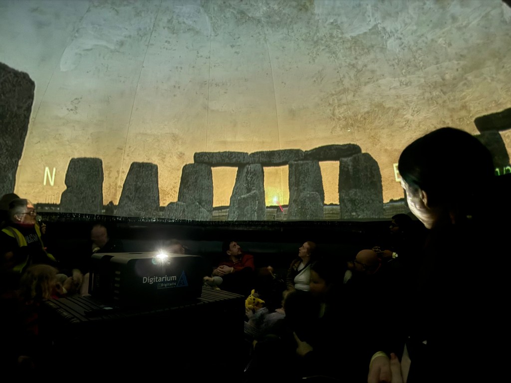 We have been lucky enough to collaborate with English Heritage in 2023 and 2024 on some big events at the Stonehenge Visitor Centre. These included shows inside an inflatable planetarium where we took visitors on a tour of the night sky and showed them the famous alignments of Stonehenge as if they were inside the stone circle four thousand years ago. In collaboration with The Sanctuary (Heritage, Craft and Wellbeing Hub) we have also built a scale replica of what Stonehenge looked like in its prime so we could show and explain the alignments.
